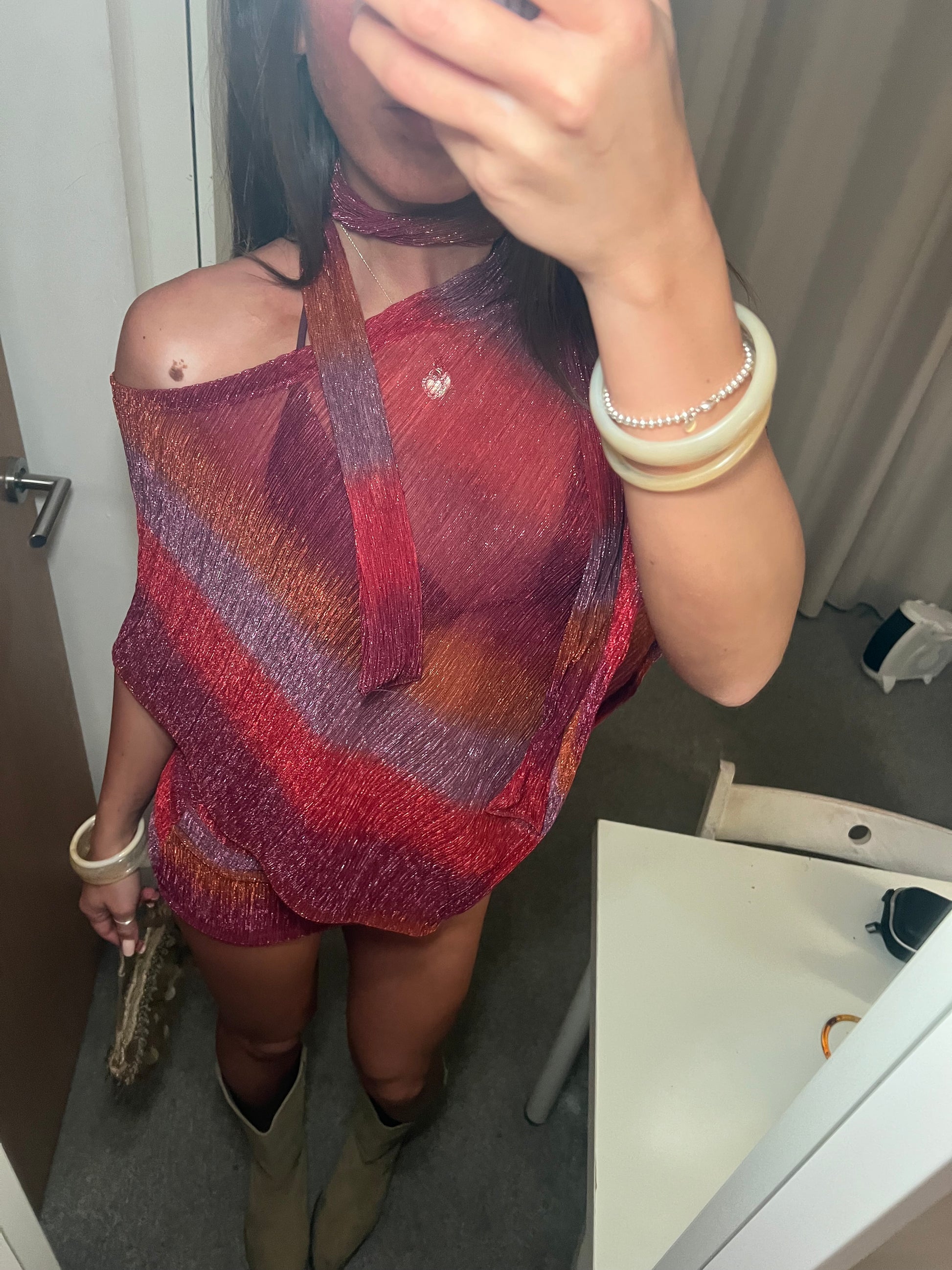 Carly is a three-piece statement set featuring a mini skirt, flowing poncho, and matching scarf. Crafted in a lightweight, semi-sheer fabric, it’s perfect for summer raves and beach club days. Effortless, bold, and made to move—pair with suede boots and a bag for the ultimate warm-weather look.